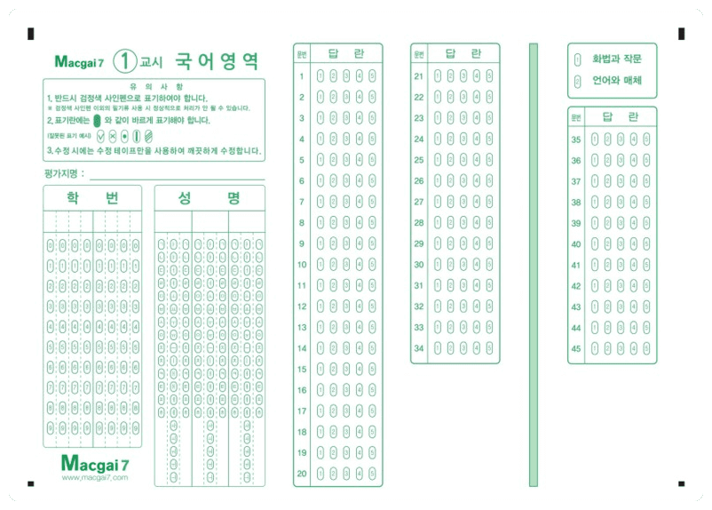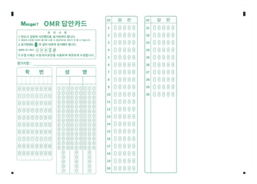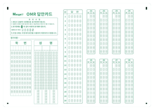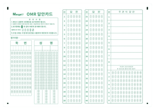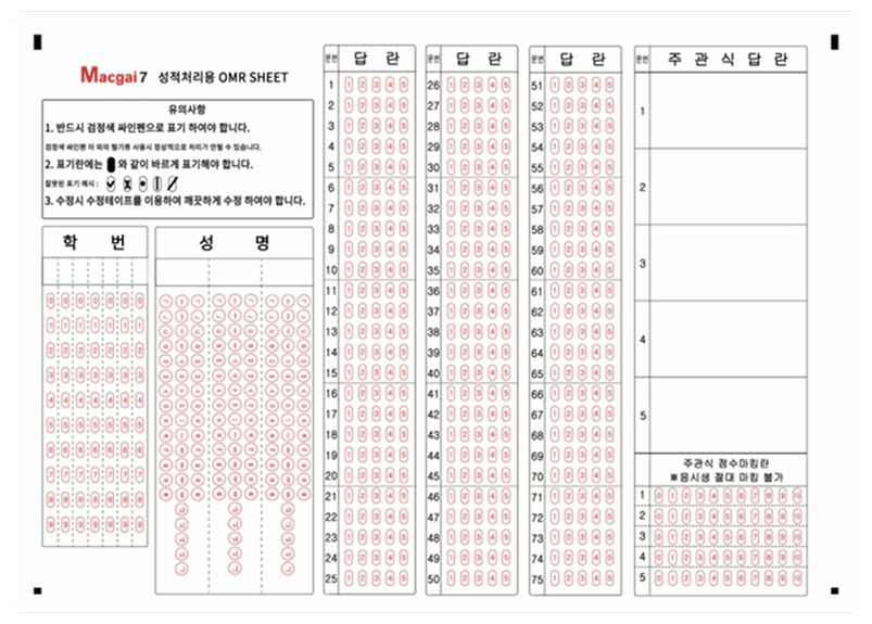 객관식, 3자리 숫자 주관식, 점수입력 주관식 이 3가지 유형의 문항을 섞어서 OMR을 제작할 수 있습니다.
